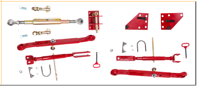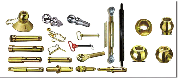 Top Link Hook, Ball For automatic Hook, Ball For Lift Arms, Top Linnk weld on ball ends, Ball for Top Link, Lower Link Weld-on-ball ends, Top Link Ends, Top Link, Lateral Tie Rod, Fixed Tie Rod, Adjustable Leveling Arm, Hitch Pin/Spring Pin (Single Grip), Hitch Pin/Spring Pin (Double Grip), Safety Clip, Tab Lock Linkage Pin, Linch Pin for Tube, Linch pin, Assorted Linch Pin, Linch Pin With Chain, Guide Cone Link age Pin, PTO Linkage Pin, Clevis Pin